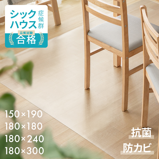 ダイニングだけでなくキッチンマットとして使ったり、ペットのケージ下に敷いたりと、アイデア次第で様々な場所で活躍します。お部屋の景観を邪魔しない透明感で、インテリアを楽しみながら抗菌・防カビ対策もできる、まさに一石二鳥のアイテムです。