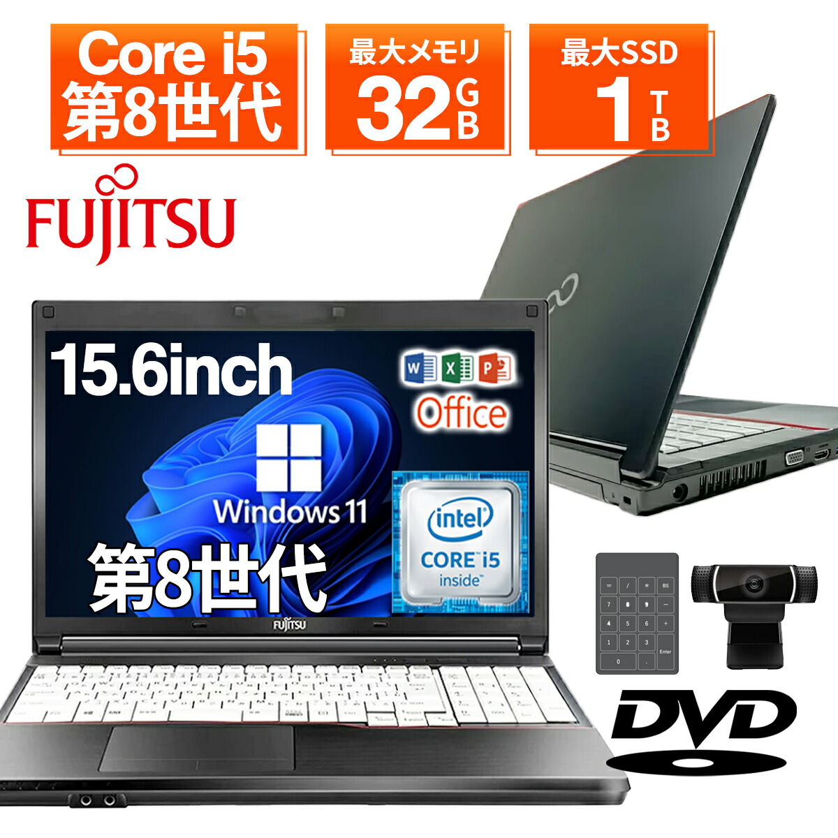 【テンキー付き & カメラ搭載 & DVDドライブ内蔵】ノートパソコン 中古 パソコン 15.6インチ 最大SSD1TB 最大メモリ32GB Corei5 8世代 Microsoft Office付き Windows11 富士通 Lifebook A579 Microsoft Office搭載 中古ノートパソコン 安い ノートPC パソコン