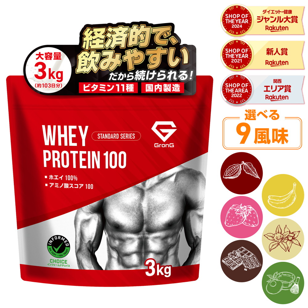 【4日20時~はポイント5倍&500円クーポン/条件有】グロング プロテイン ホエイプロテイン 3kg スタンダード 風味付き ナチュラル ビタミン11種配合 GronG 置き換え ダイエット タンパク質 サプリメント アミノ酸スコア100 美味しい 送料無料 ポイント
