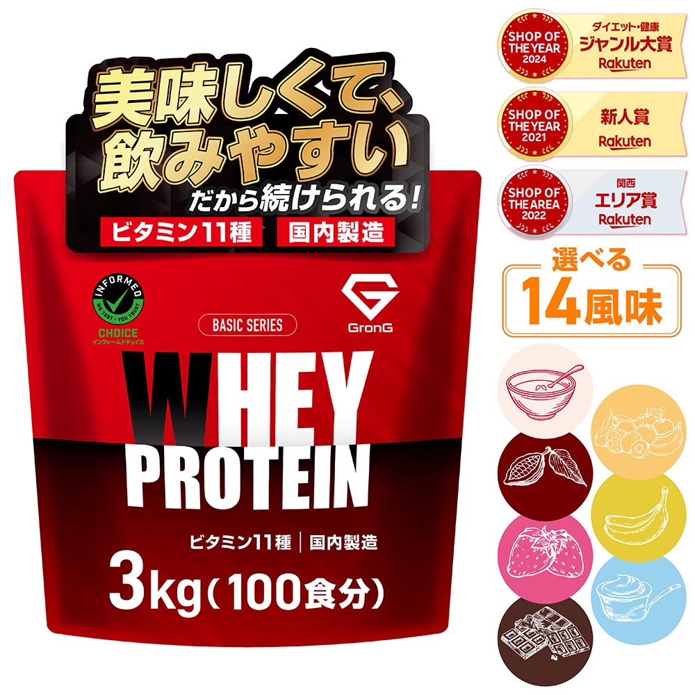 【4日20時~はポイント10倍&500円クーポン/条件有】グロング プロテイン ホエイプロテイン 3kg ベーシック 風味付き ビタミン11種配合 GronG 置き換え ダイエット タンパク質 サプリメント アミノ酸スコア100 美味しい 送料無料 ポイント