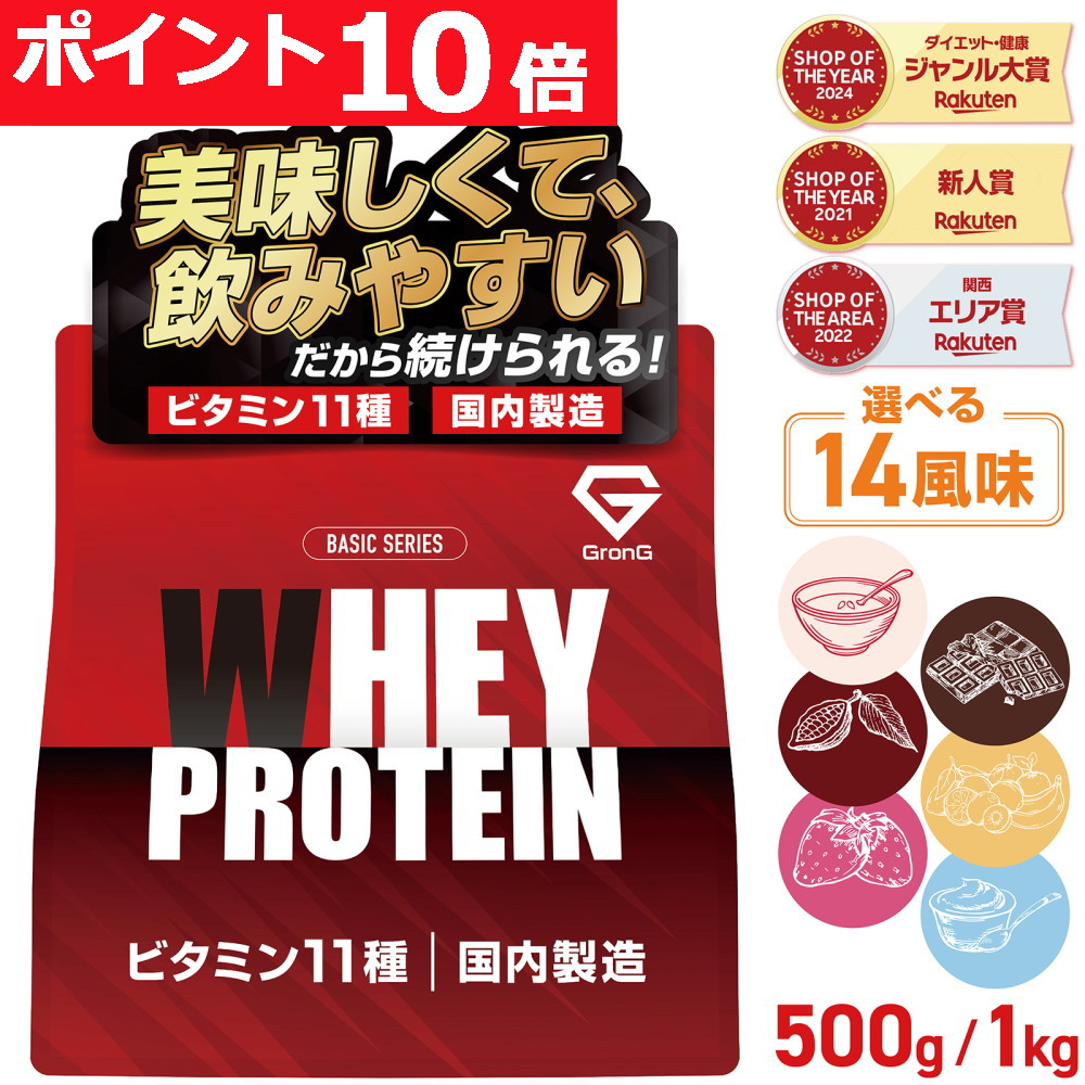 【ポイント10倍&500円クーポン/条件有】グロング プロテイン ホエイプロテイン 1kg 500g ベーシック 風味付き ビタミン11種配合 GronG 置き換え ダイエット タンパク質 サプリメント アミノ酸スコア100 美味しい 送料無料
