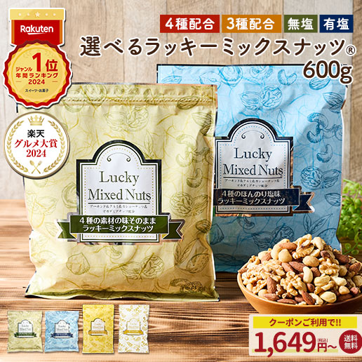 \今だけ5%OFF★3袋まとめ買いクーポン/ミックスナッツ ナッツ 4種 3種 600g 無塩 有塩 ミックスナッツ ラッキーミックスナッツ 送料無料 無添加 アーモンド くるみ カシューナッツ マカダミアナッツ