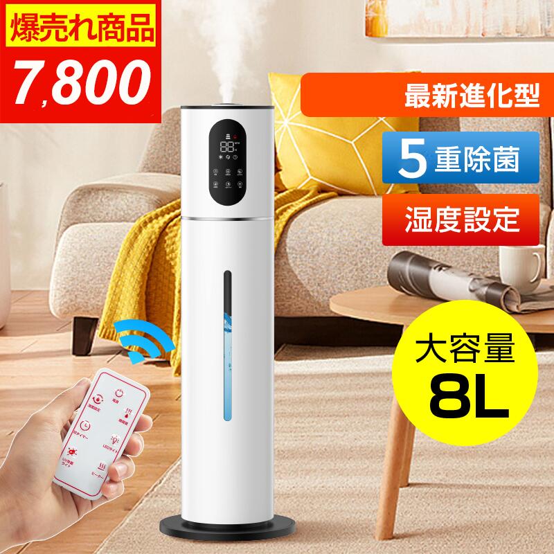 楽天1位!<値下げ13,800→7,800円>【爆売れ商品・2026進化型】加湿器 大容量 除菌 タワー加湿器 5重除菌 次亜塩素酸水対応 8L 超音波加湿器 UV除菌 加湿器 湿度センサー 上から給水 お手入れ簡単 40畳対応 静音 リモコン アロマ【7日間返品保証+2年保証】UVC安全証明&PSE