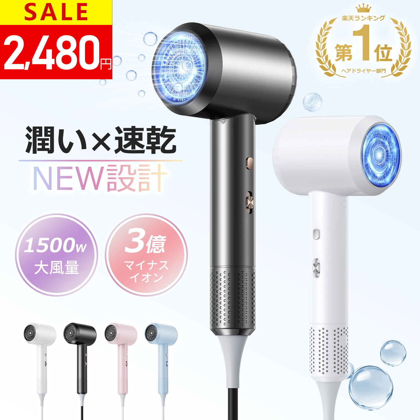 \SS限定87%OFFで2,480円!楽天1位/春の新色入荷★ドライヤー 大風量 1500W 速乾 ヘアドライヤー 3億高濃度マイナスイオン 髪質改善・静電気防止 ドライヤー 大風量 冷熱風 3段階風量 低騒音 過熱保護 ノズル・壁掛け付 ドライヤー 海外対応 軽量 コンパクト 家庭用/旅行用
