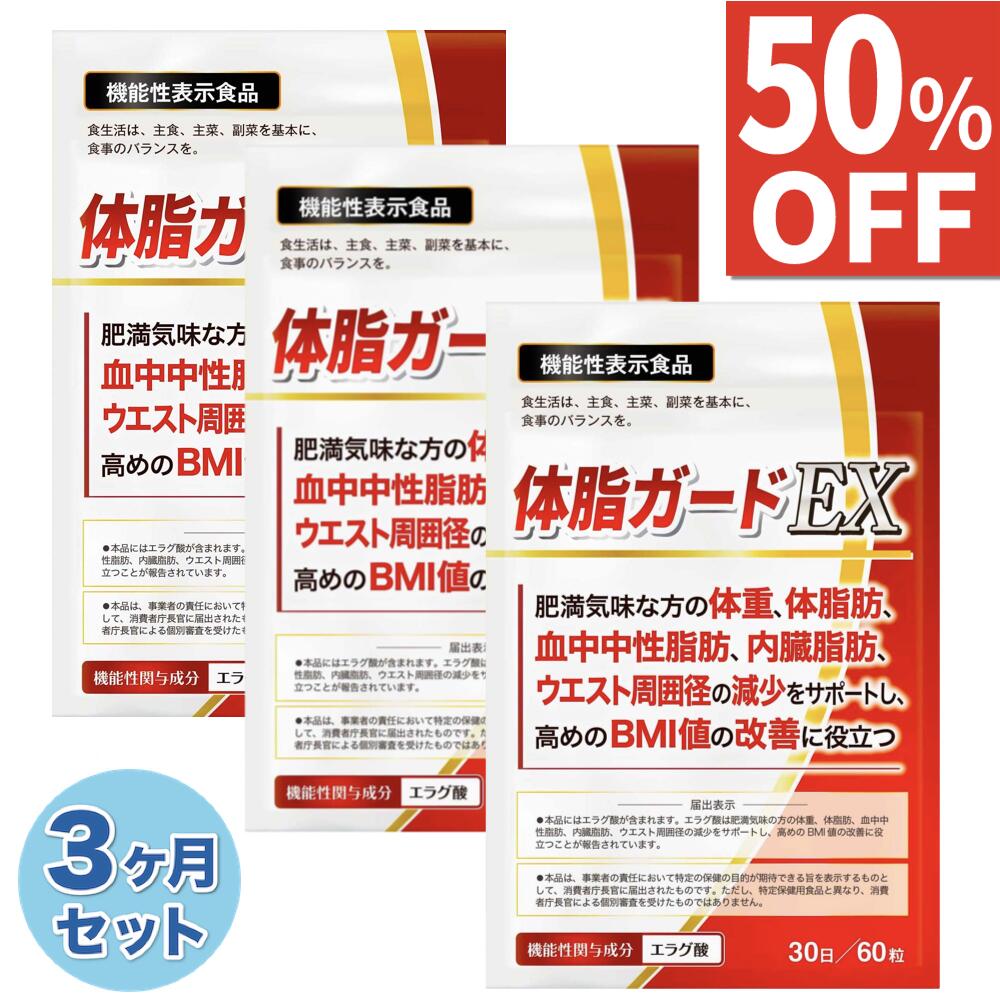 【50%OFF】 3ヶ月セット(90日) ダイエット ダイエットサプリ エラグ酸 3mg お腹の脂肪を減らす 体重 体脂肪 ダイエット サプリ 中性脂肪 内臓脂肪 減らす 下げる ウエスト周囲径 減少サポート BMI値 改善 カルニチン 体脂ガードEX 90日分 送料無料 機能性表示食品